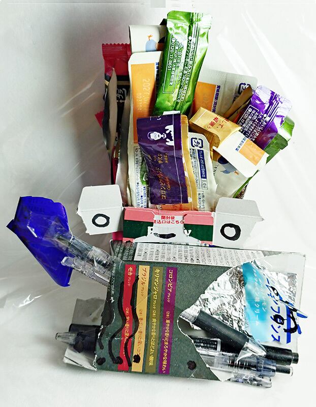 ティーパックの梱包材などやボールペン等を使って作りました。